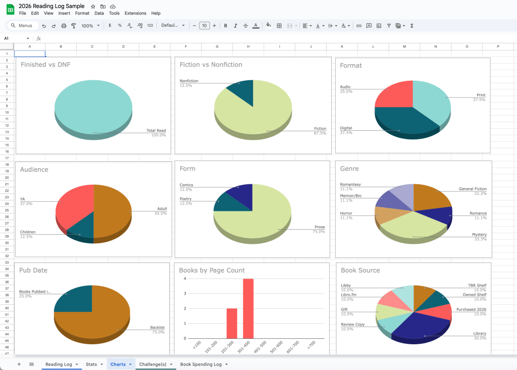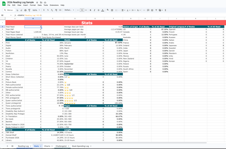 This log doesn’t just track what books you read and all of the various information and data bits about the books you read, but it also has the ability to track reading challenges (either ones you make up for yourself or other challenges from across the internet) and how many books you acquire/buy! Plus, it generates fun visuals of all of your reading statistics, which is honestly my favorite part and 99% of the reason why I use it. It’s also highly customizable, so you can tweak it to suit your reading life (more on that below). First, here’s a quick look at the 2026 log: