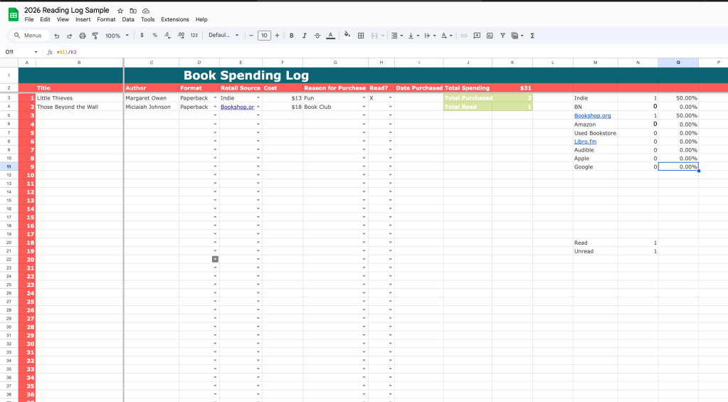 Finally, this is totally optional, but maybe you want to track how many books you buy in a year. (This can be dangerous.) This tab tracks your purchases and purchase source and how much money you spend, and how many of the books you read each year. I also find this useful to make sure I actually read the books I buy and don’t let them languish on my shelves.